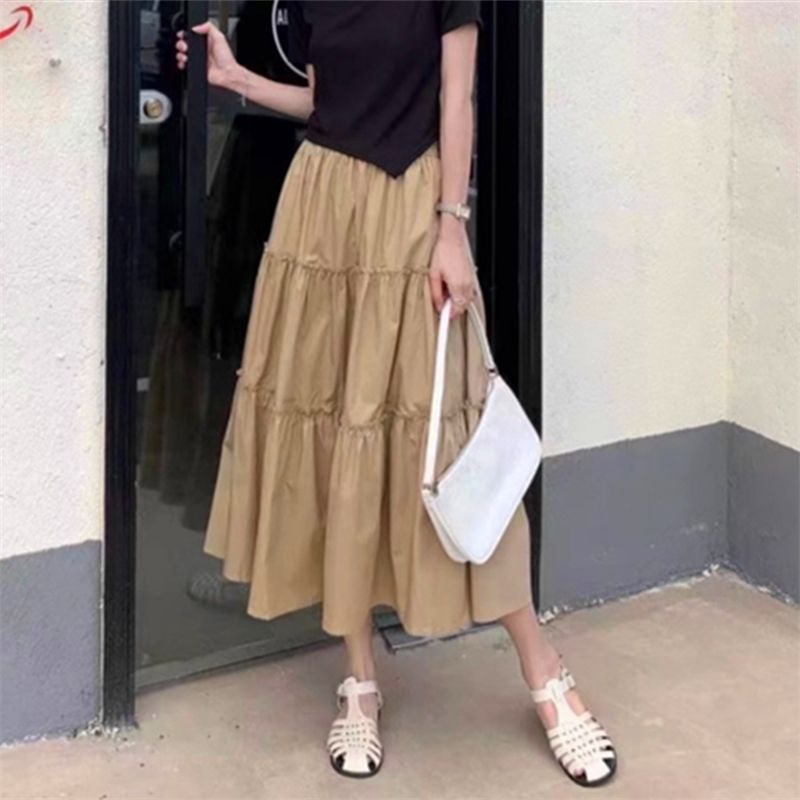 韓国版の新しい夏のハイウエストスカート、優しいスタイル、耳付きスプライシング、スリムなAラインケーキスカート、ファッショナブルで年齢を軽減します
