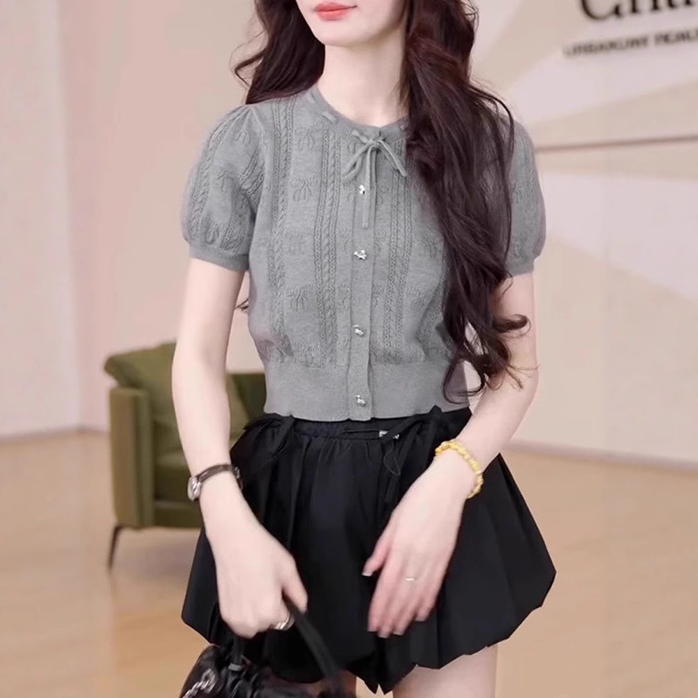 甘くて優しいスタイルの中空リボンセーターレディースフレンチスリムフィット万能老化防止パフスリーブショートTシャツ夏