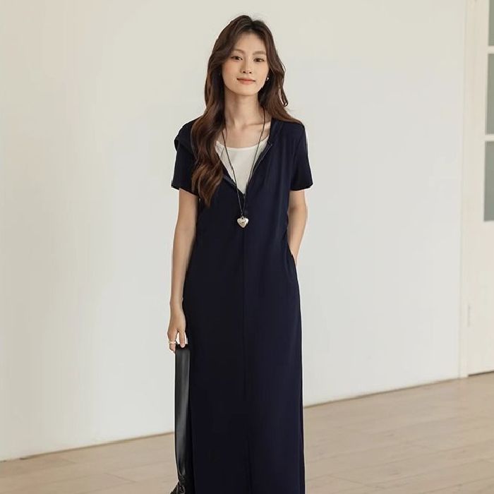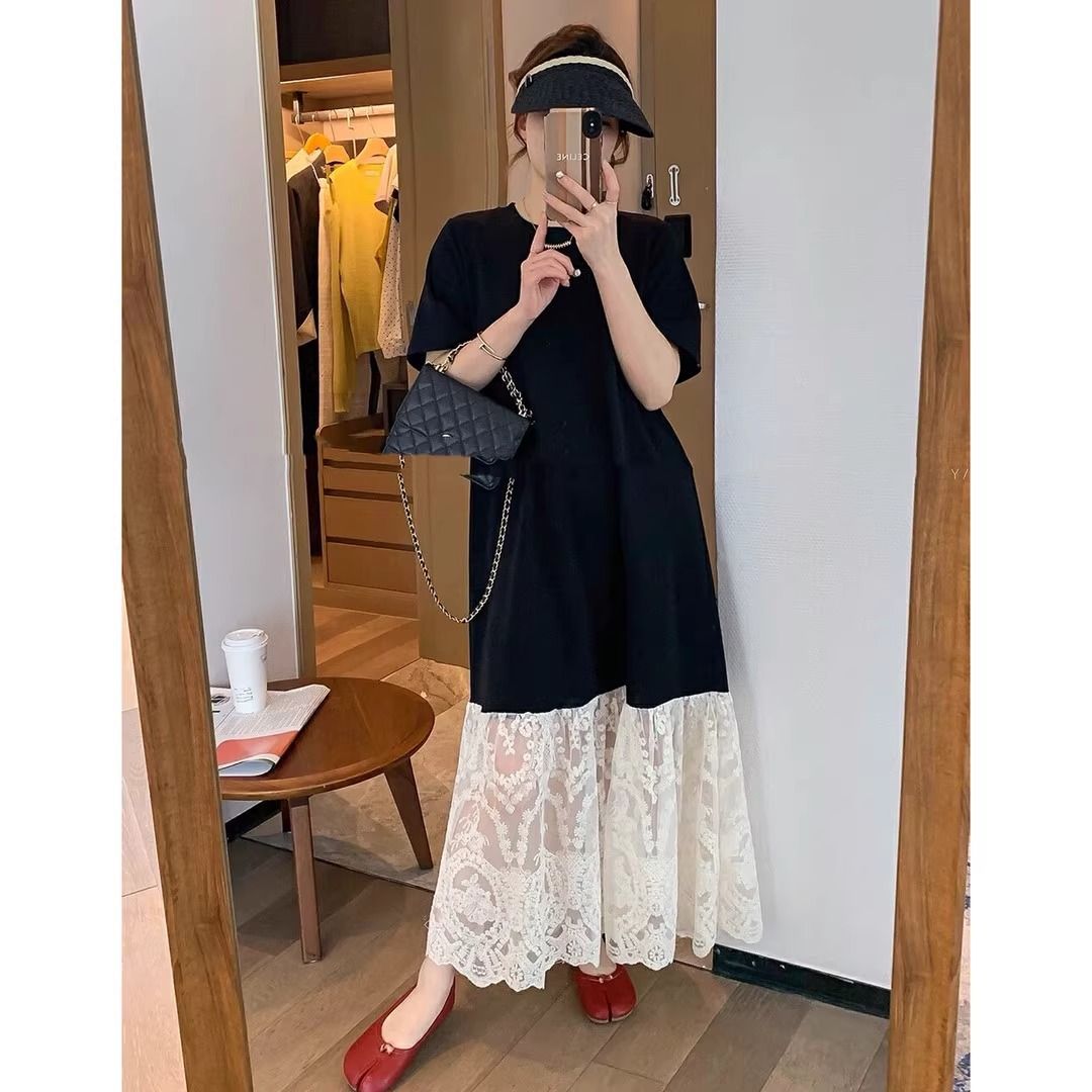 フレンチコントラストカラーステッチレースストレート半袖ドレス2025新作レイジースタイル痩身通勤スカート