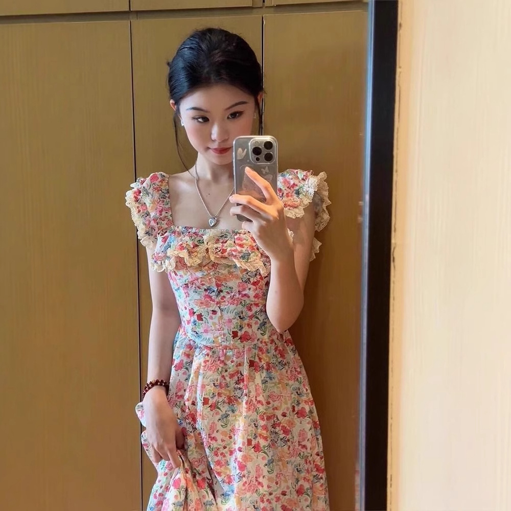 海辺での休暇の気質ドレス、夏のフレンチスタイル、優しくシック、小さなフライングスリーブ、花柄の妖精のドレス、ウエストを細くする