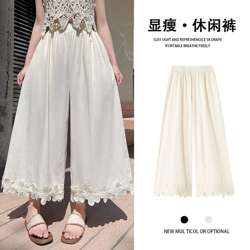 韓国版の年齢を軽減する女性用のゆったりとしたワイドレッグパンツ、新しい花柄のスプライシングの薄いハイウエストのスリムで背の高いカジュアルパンツ
