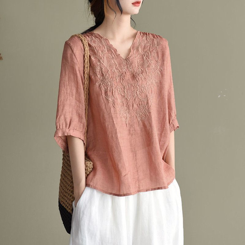 シャツ夏の新しいレトロ文学薄い刺繍半袖コットンとリネントップ女性のためのエスニックスタイル V ネック純粋な綿 Tシャツ女性のための