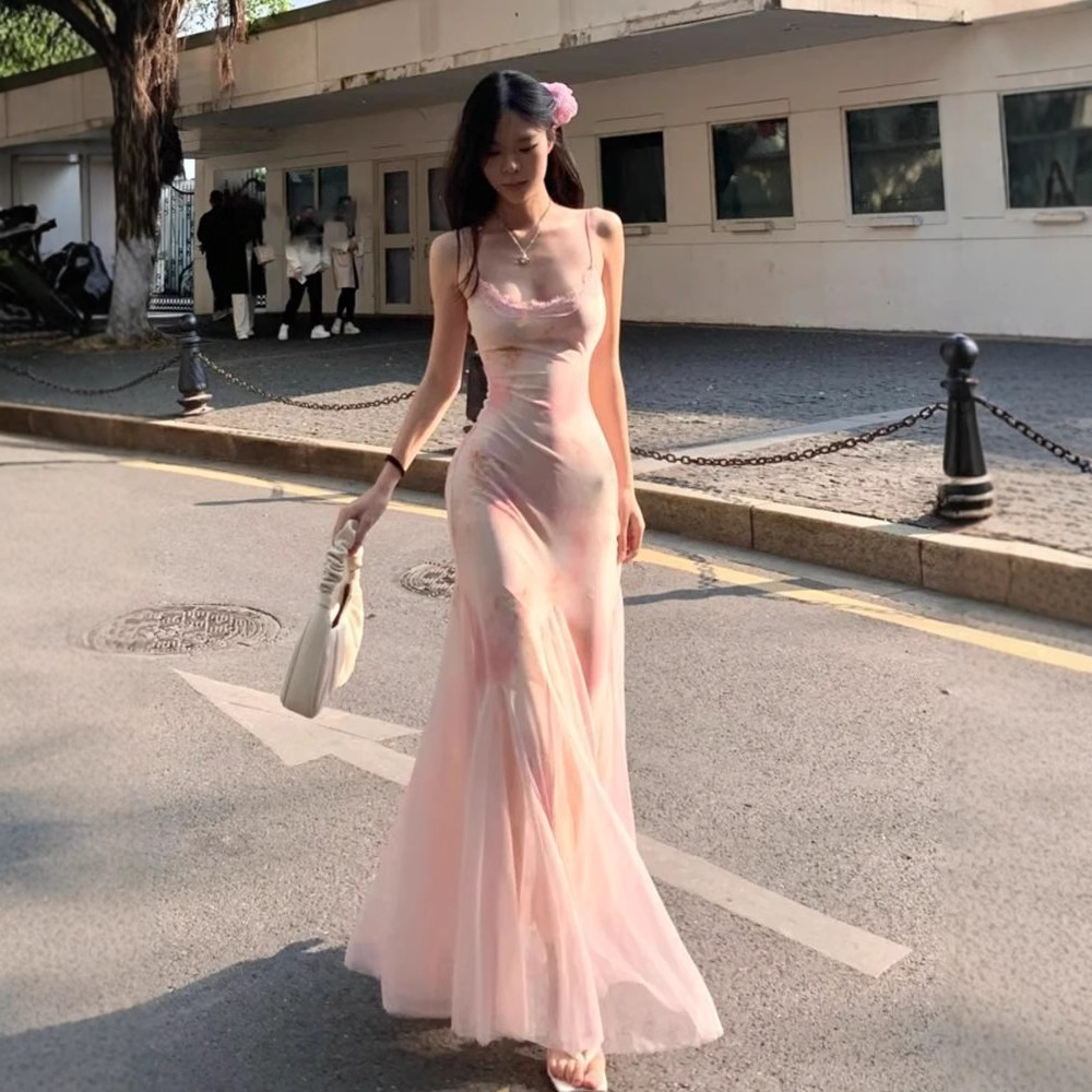 ノースリーブ花柄ドレス女性の夏のスーパーフェアリーピンクガーゼスカートセクシーなヒップカバーウエストスリムフィッシュテールスカート