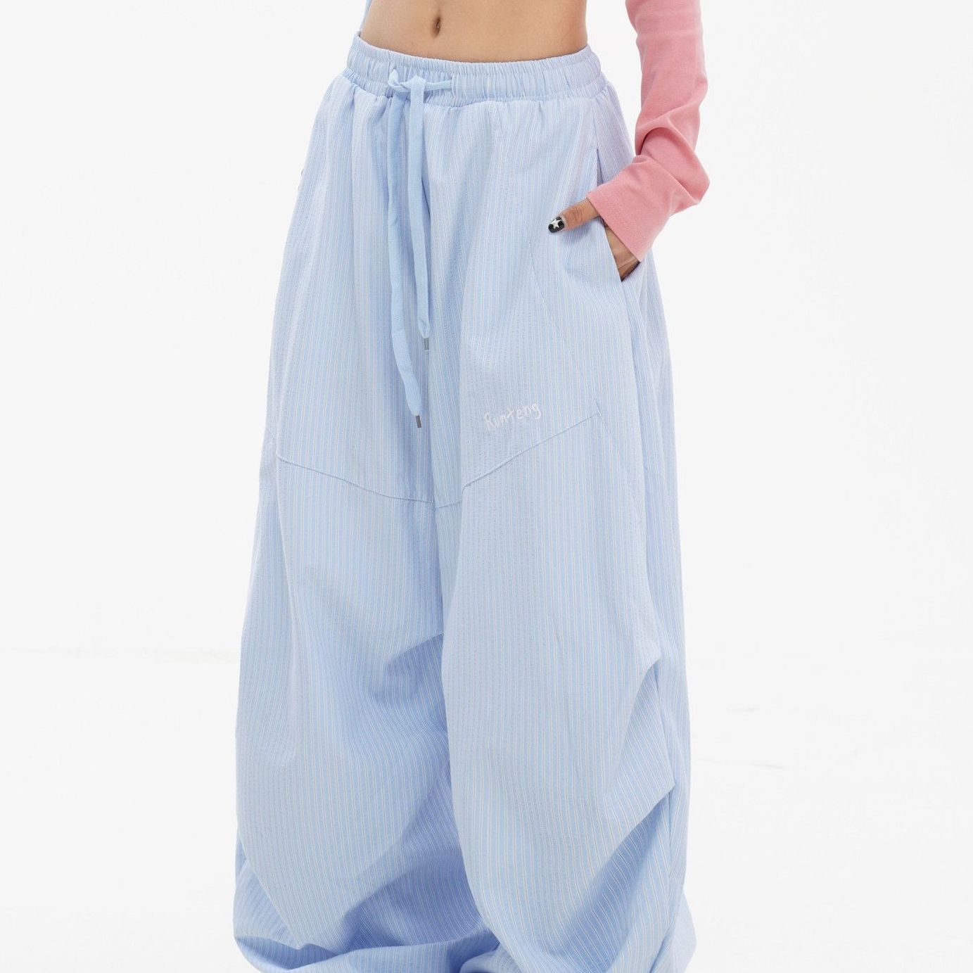 女性用の快適なストライプのライトブルーパンツ、ゆったりとしたオーバーオール、ストレートカジュアルワイドレッグパンツ、夏の万能パンツ