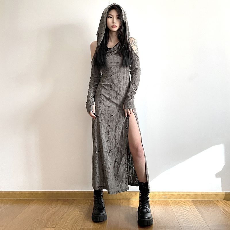 廃土風アメリカ破穴ワンピース女性2024秋の薄いギャルデザイン感の中で長いフォークスカート女性