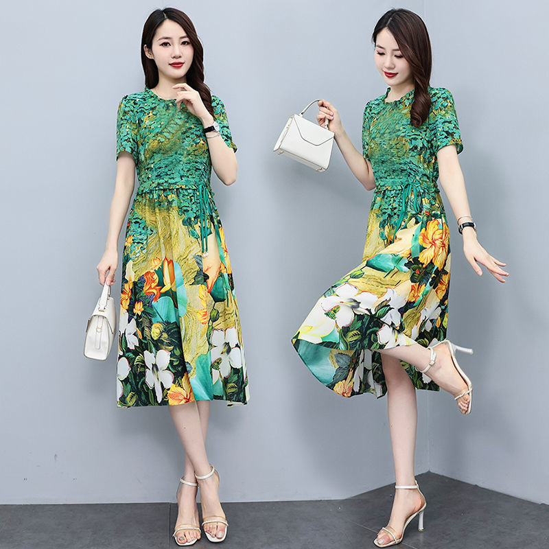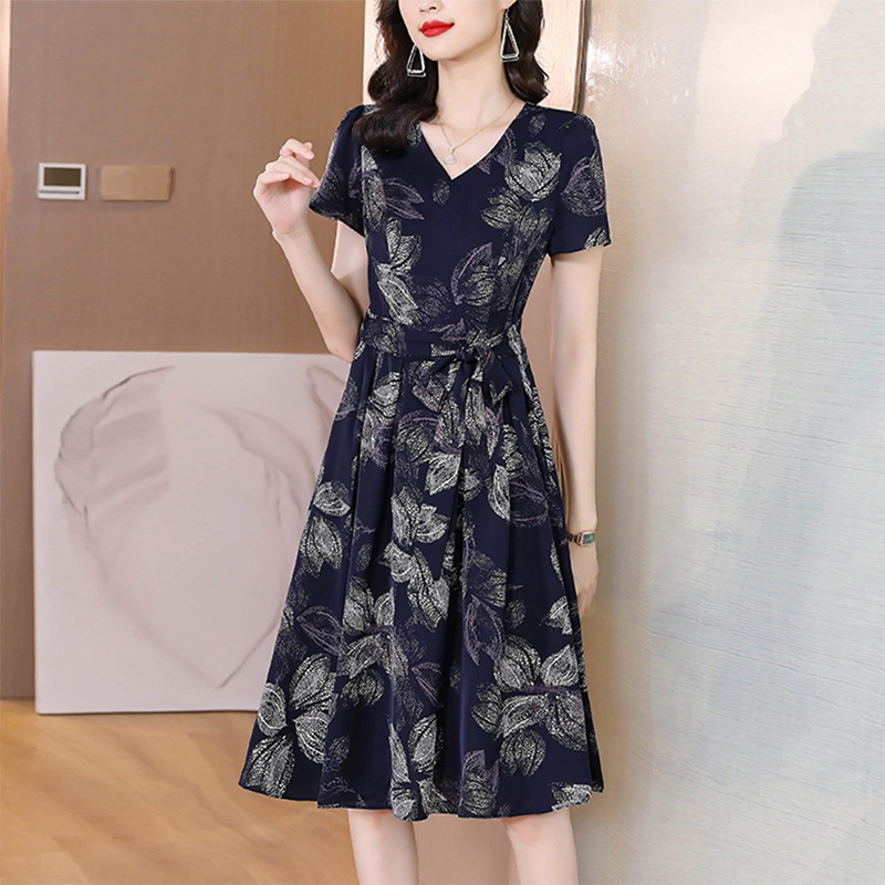 氷糸砕花半袖vネック気質は腰を収めて痩せているa字スカート韓国版夏の中で長いタイプのお母さんの年齢を減らすワンピースです。