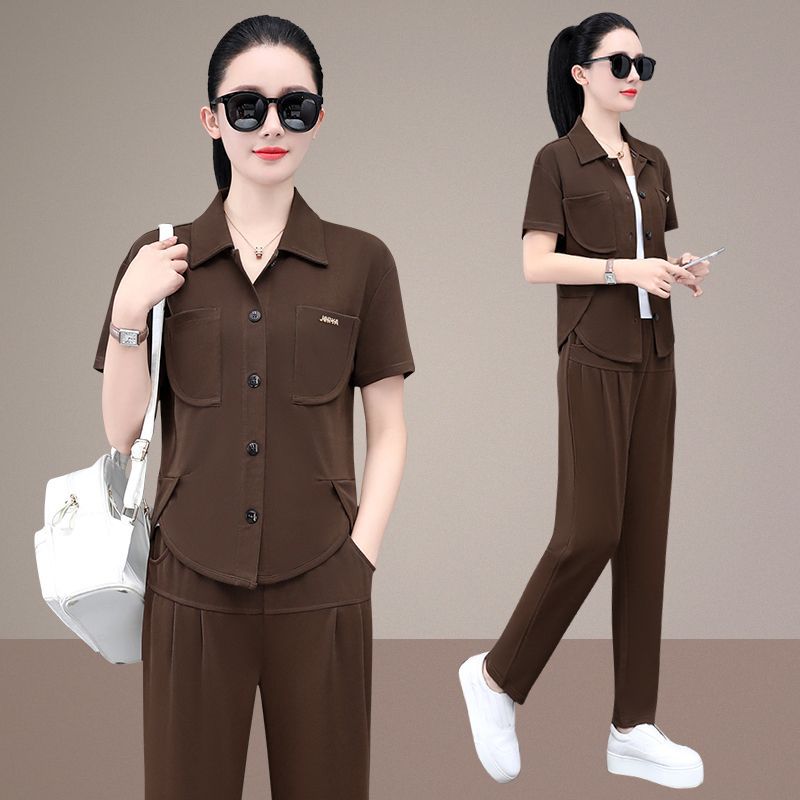 カジュアルスポーツのお母さんの大きいサイズのスーツの韓国版の夏の新型はやせている半袖の上着の高腰のハーレムのズボンの2つのセットを現します。