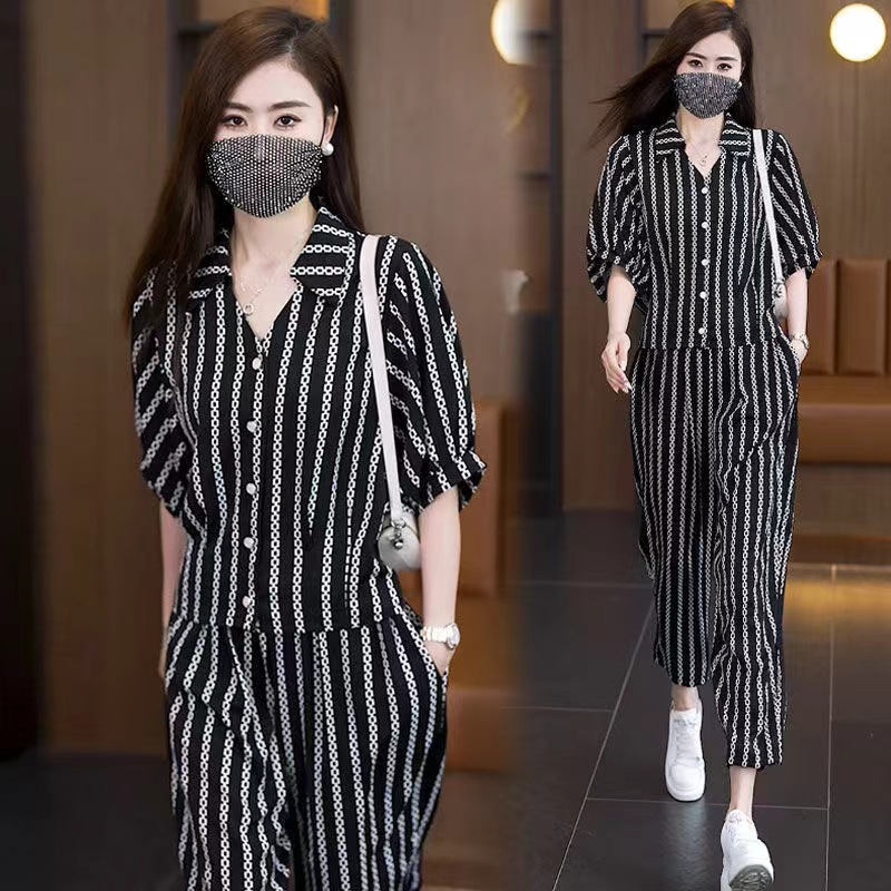 夏の薄いファッションのカジュアルな組み合わせのスーツの女性の韓国版の新型のプリントの半袖の上着の広い足のズボンの2つのセットの潮