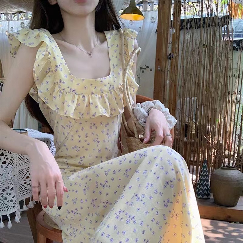 小飛袖砕花気質ワンピースの中の長さの四角襟の袖なしのベストスカートの夏の新型は腰のハスの葉の縁のスカートを収めます。