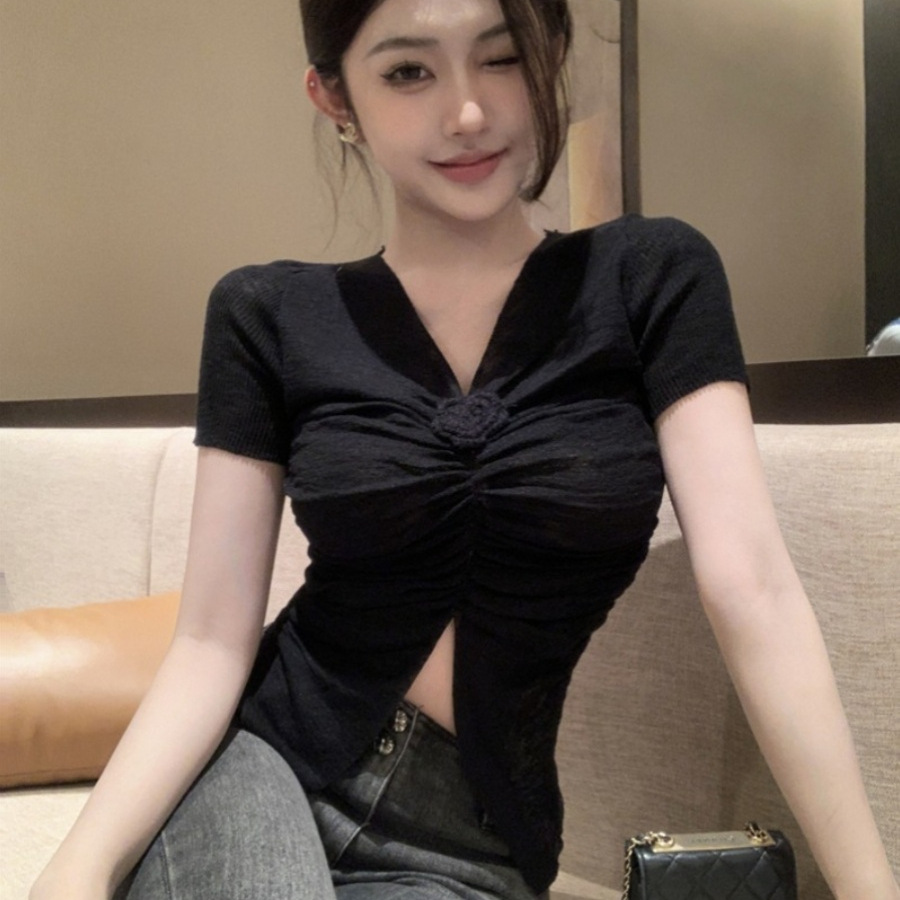 デザイン感のしわの立体的な花が開いてセクシーな短いタイプの臍の上着の夏の新型のvネックの修身の半袖のtシャツ