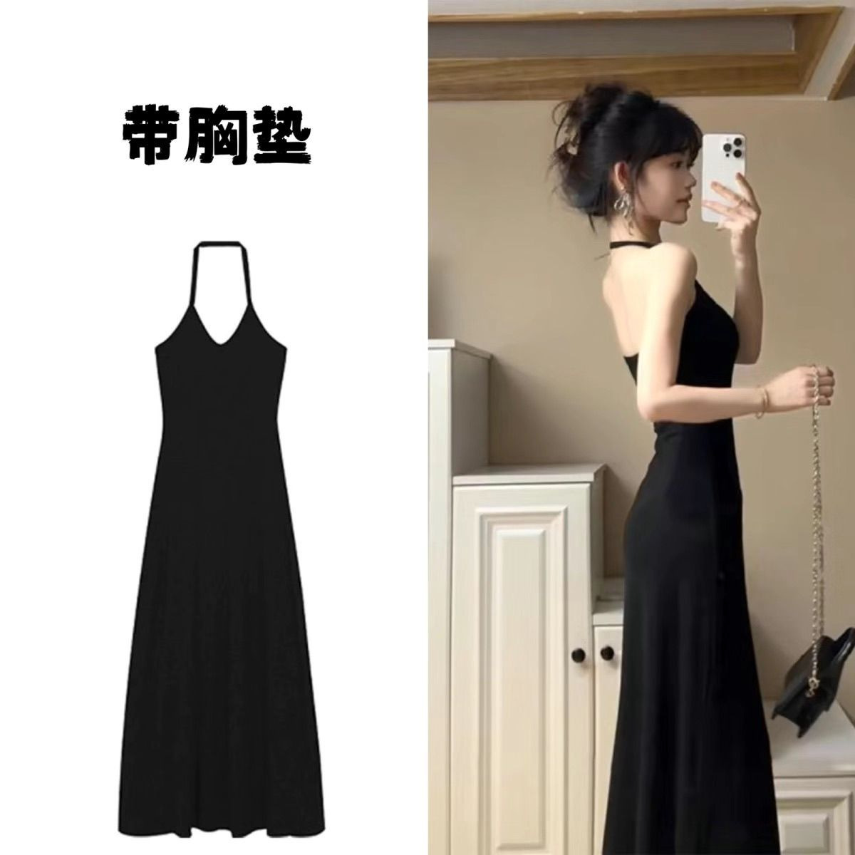 純粋な欲風のセクシーな首を掛けて肩の美背のワンピースの夏の新型の純色の小さい黒いスカートの気質は胸のパッドのスカートを持ちます。