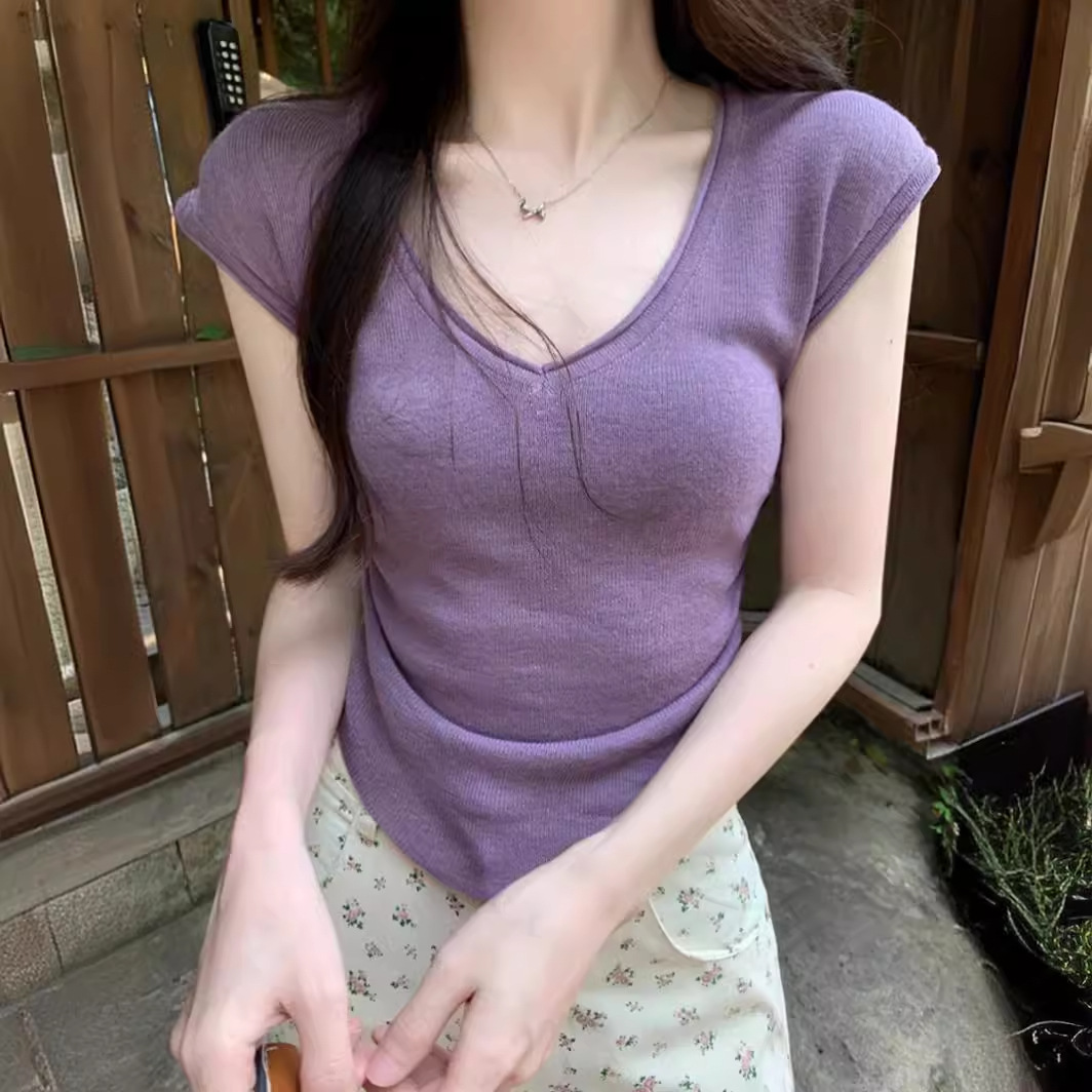 紫色のvネックのデザインの不規則なニットの韓国版の夏の新型の修身はやせています。