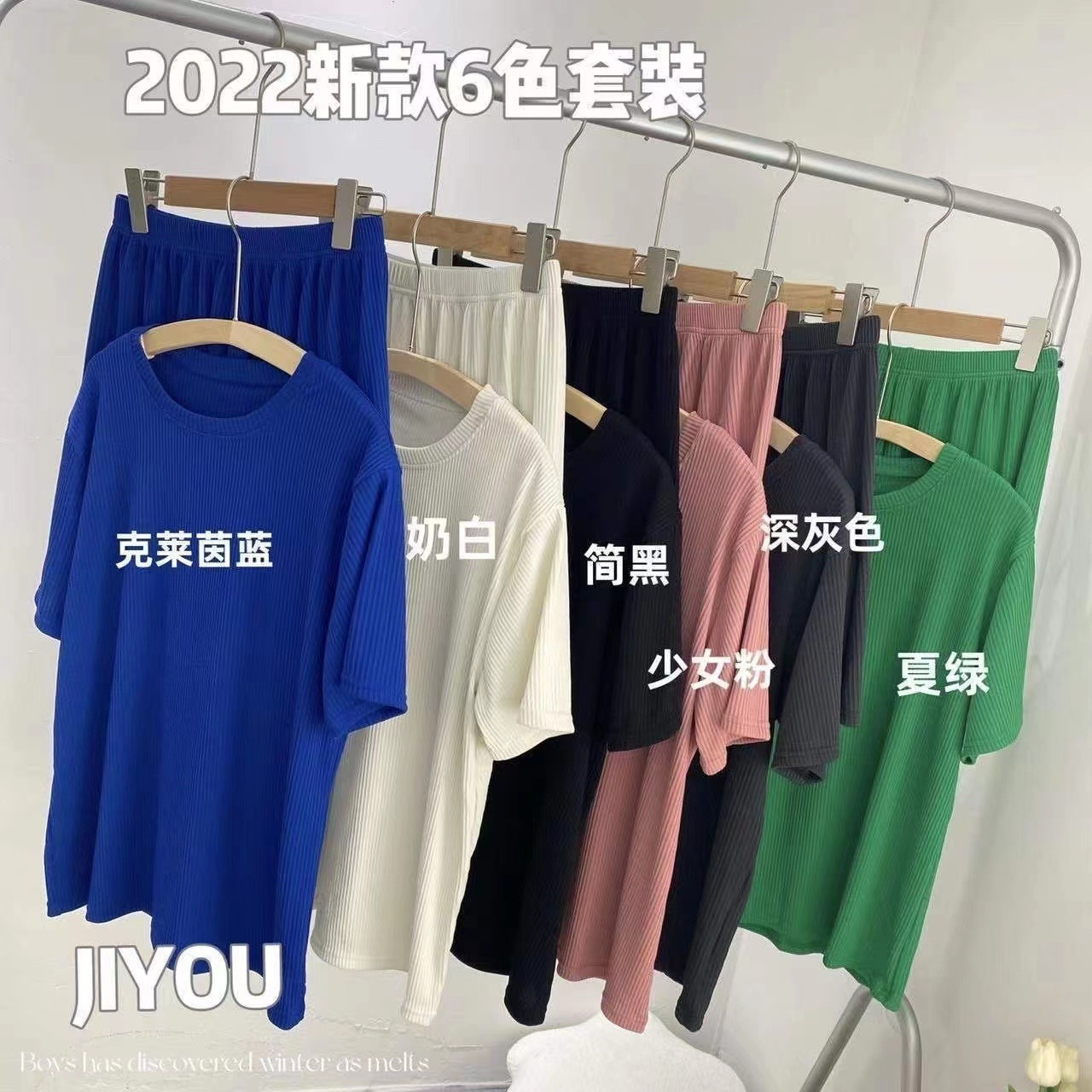氷糸カジュアルルーム服2024夏の新型の怠惰な風の純色のゆったりした半袖半ズボンの大きいサイズの2セットの女性