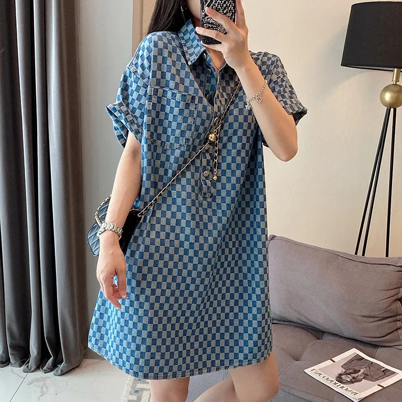 太ったmm盤プリントデニムブルーワンピースの中長タイプの夏の新型polo襟露肩半袖大サイズ女装