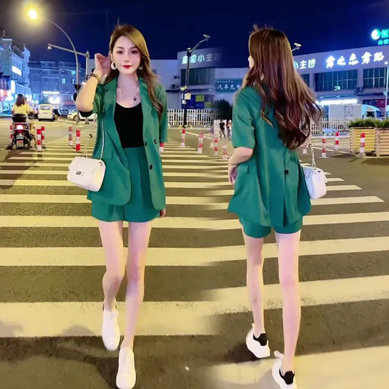 大きいサイズの婦人服の夏の韓国版の新型の気質のゆったりしている半袖のカーディガンのスーツのコートの広い足の半ズボンの2セットの女性