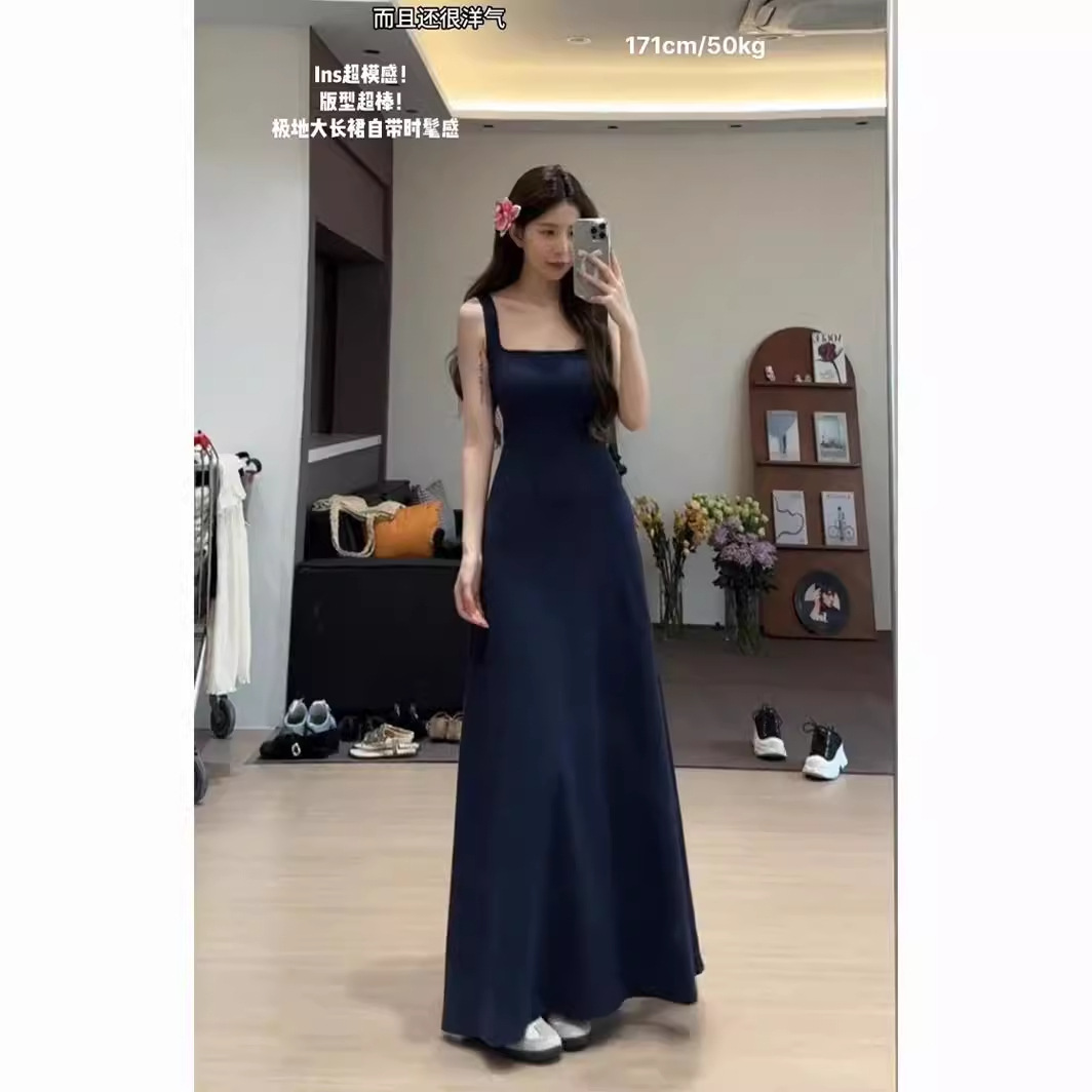 クールなシルク綿の少女のストラップは腰のa字のスカートの夏の襟の気質を収めてワンピースの中の長い甘美なスカートを引き受けます。