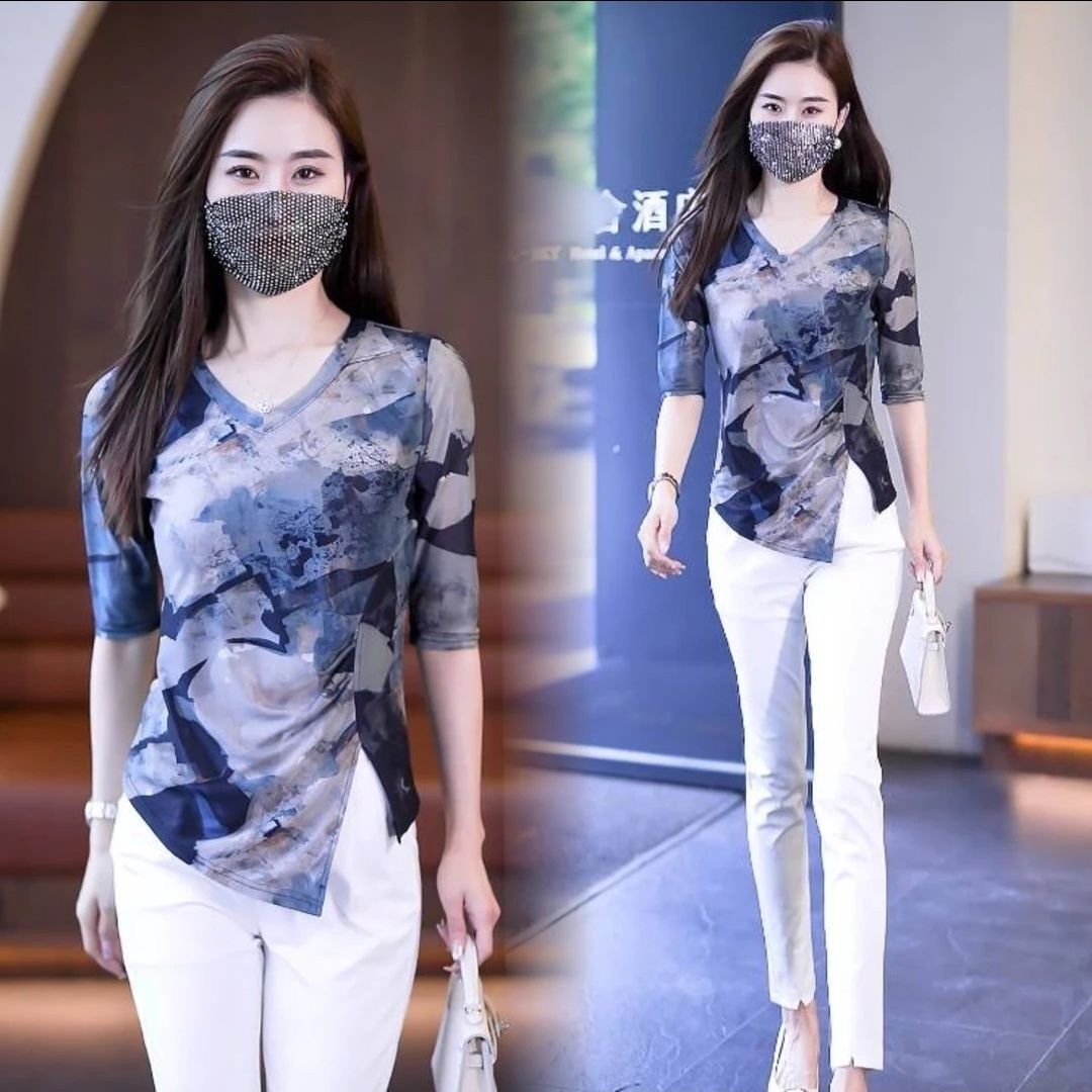 水墨画プリントtシャツ女性2024夏の薄いファッションvネックデザイン