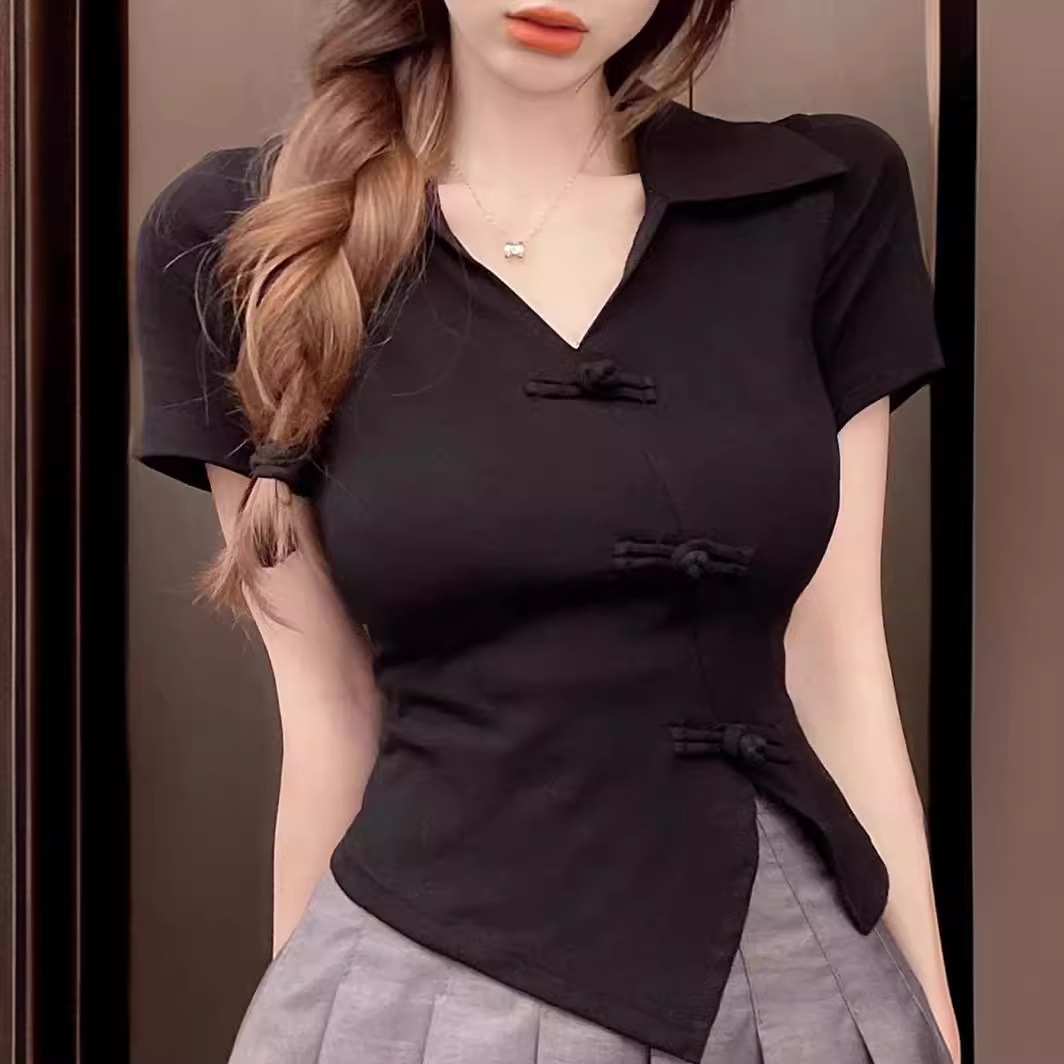 ギャルの純欲の短いポロシャツの夏の肩の短い黒いデザインのタイプは小さい大衆の新しい中国風の上着を開きます。