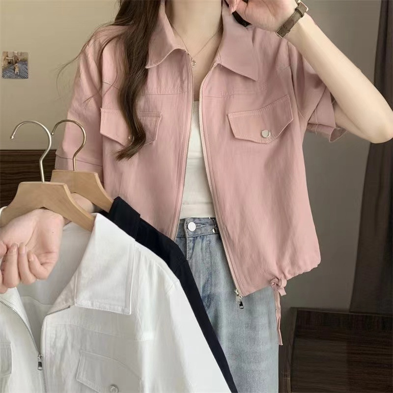 襟をひっくり返して肩の半袖のファスナーのカーディガンの上着の女性の夏の新型のゆったりしていてやせています。