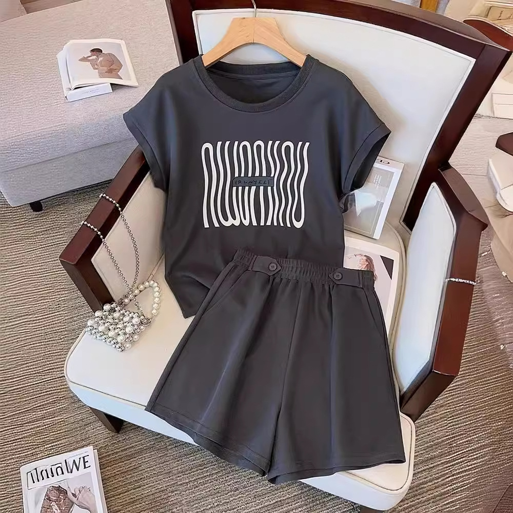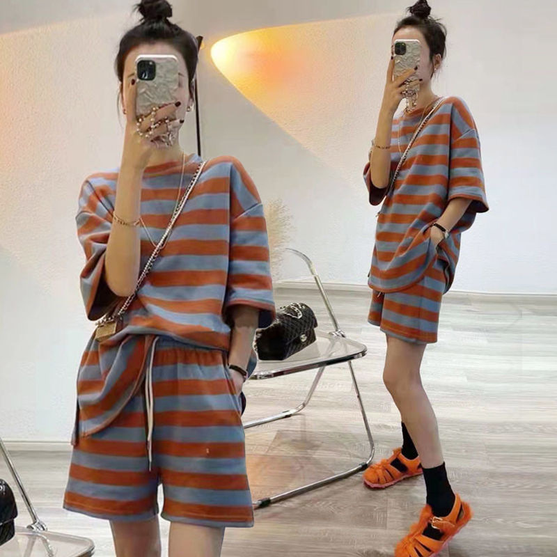 大きいサイズの婦人服2024レジャースポーツのストライプの家庭服の夏の韓国版の外は半袖の半ズボンの2つのセットの女性を着ます。