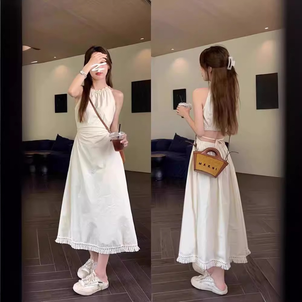 大衆のデザインの透かし彫りの背もたれのワンピースの夏の新型の首の白いスカートの気質は腰のフリンジスカートを収めます。