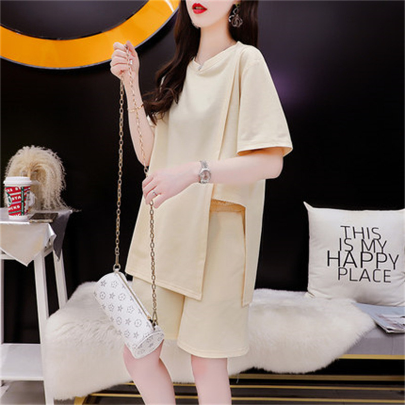 太った妹のゆるい運動レジャースーツ2024夏の韓国版半袖上着のワイドパンツの2セットの女性
