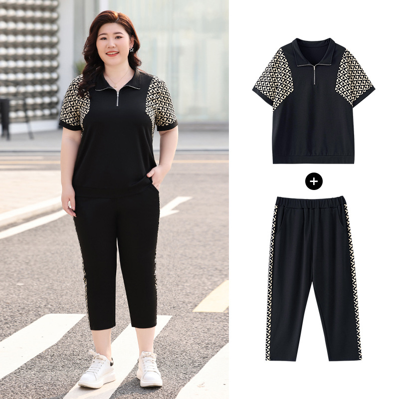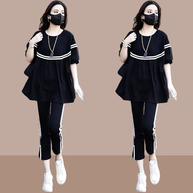太ったmmの大きいサイズの女性の夏の衝突色は緩いカジュアルな半袖のtシャツの上着のハーレムのズボンの運動の2つのセットをつなぎ合わせます。