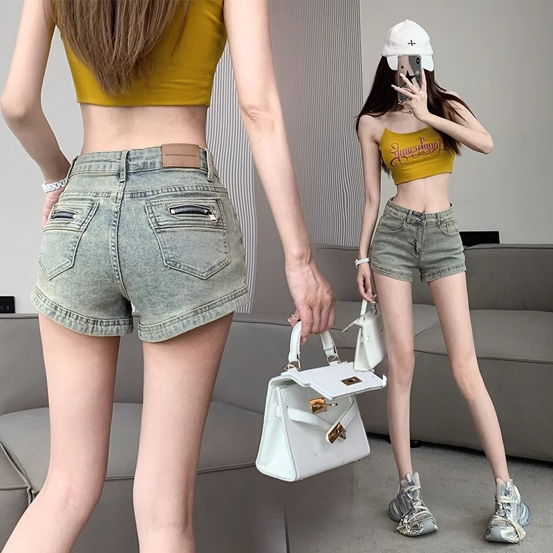 アメリカのレトロなデニムのショートタイプの女性2024夏の新型の薄い色のハイウエストはやせています。