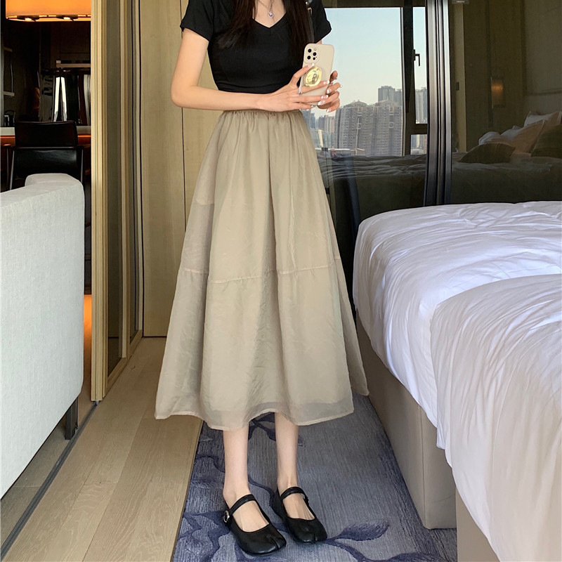 裏地付き高腰a字スカート2024夏の新型欧根紗純色百合半身スカートファッションゆるいスカート