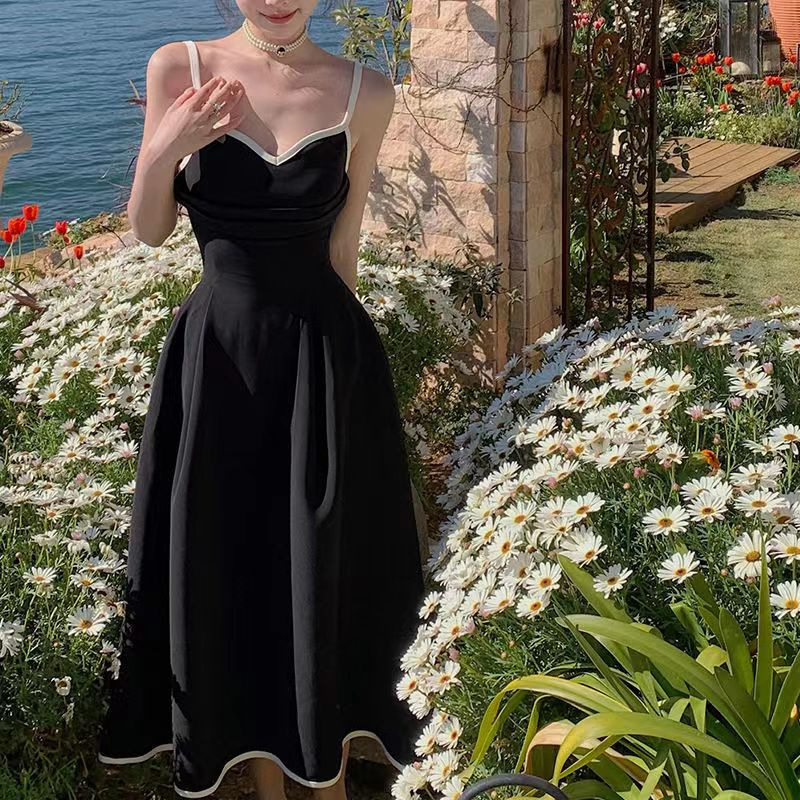 セクシーなストラップの気質の底のスカートのフランスの新型の小さい黒のスカートの夏の中で中に長いタイプの赫本の風の百合のワンピースの女性