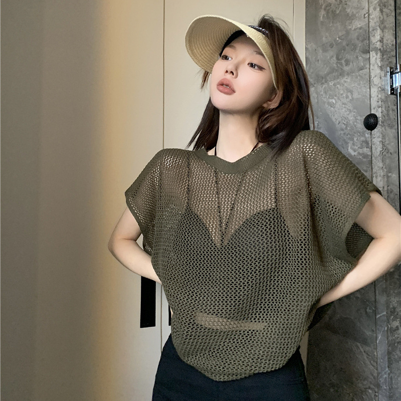 透視透かし丸首半袖ブラウス2024韓国版ゆるい百合上着夏の新しい気質ニット女性