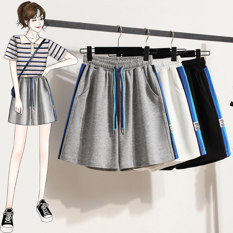 太ったmmファッションの大きいサイズの婦人服2024韓国版の夏の新型のストライプのpolo上着の高い腰の広い足のズボンの2つのセット