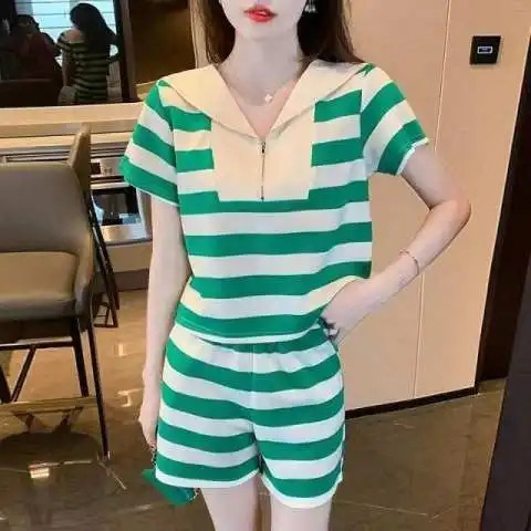ファッションの夏の婦人服2024韓国版の新型はゆったりしていて、やせている半袖の上着の高腰のカジュアルな半ズボンの2セットの女性です。