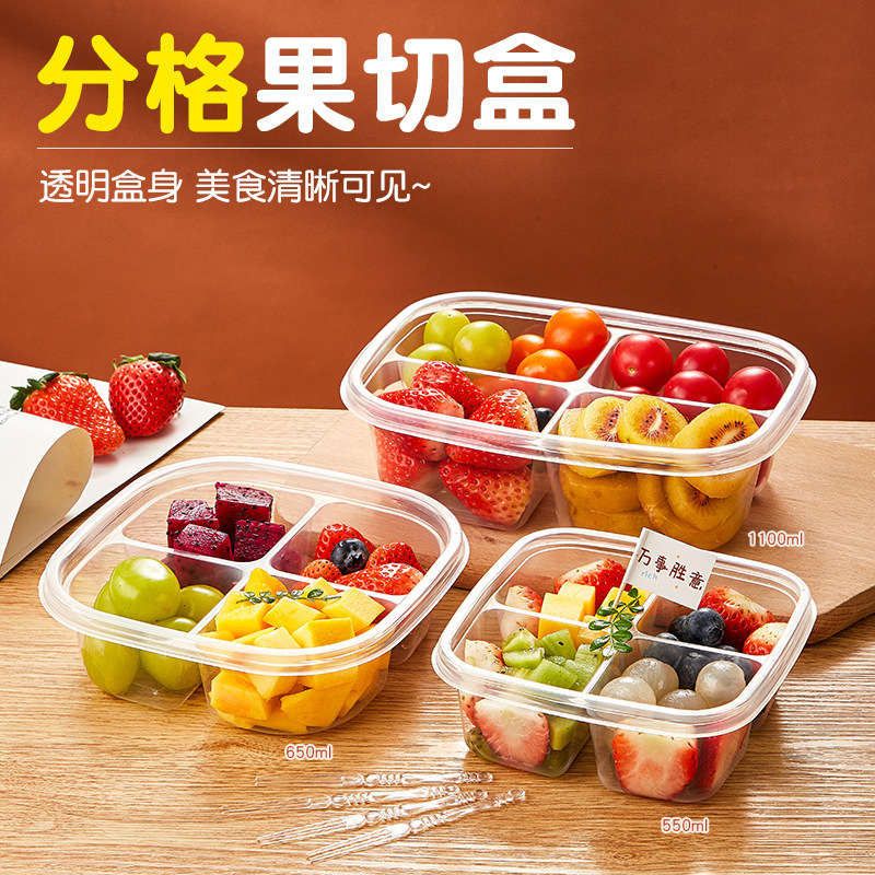 使い捨ての果物の箱の包装の箱の4分の格は外出して食品級の弁当のプラスチックの蓋の果物を持って箱を切ります。