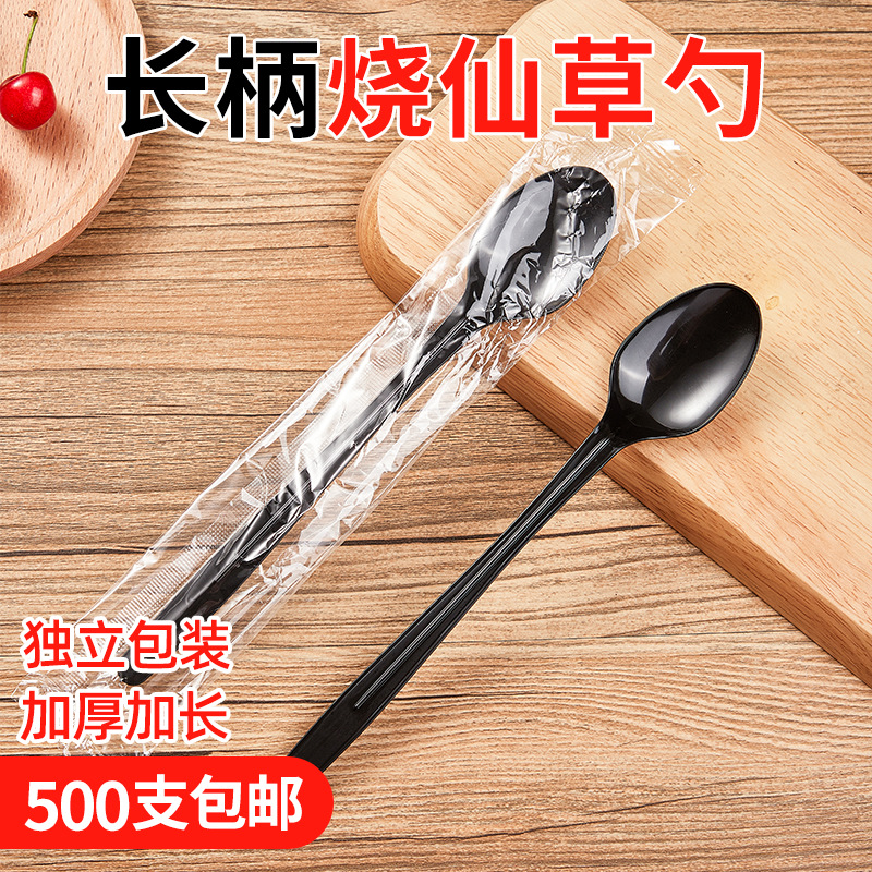 使い捨ての仙草の長い柄のスプーンのプラスチックの黒色の食品級の長いスプーンのミルクティーの業務用の単独の包装の100本