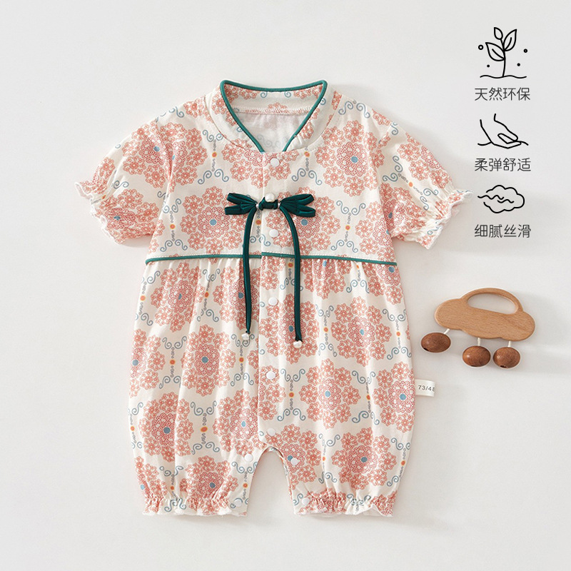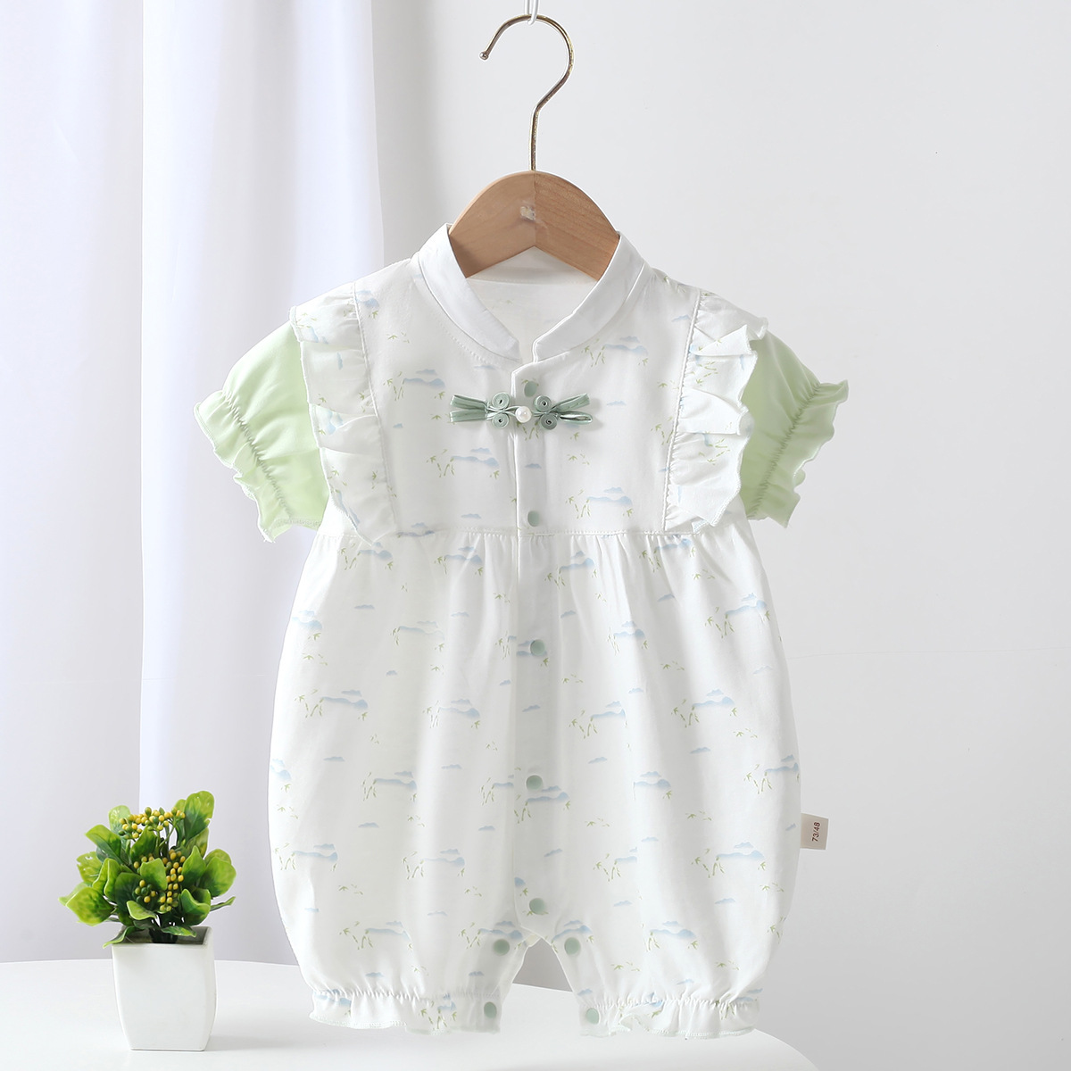 女の赤ちゃんジャンプスーツ夏薄い新しい中国風のボタン半袖ロンパース子供プリンセス花柄ホーム服