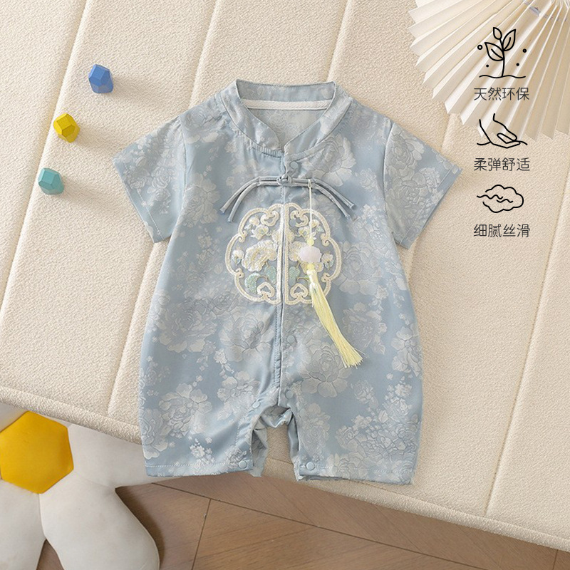 ベビージャンプスーツ、夏用薄手の新しい中国風半袖お出かけ服、男女ベビー服、中国風錦織ロンパース