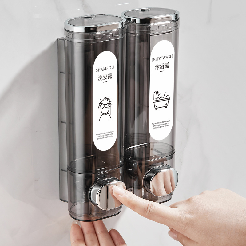 ホテルのホテルの石鹸ディスペンサーのトイレの黒いダブルヘッドの壁掛けは穴を開けないで家庭用シャンプーを押して箱を入浴します。