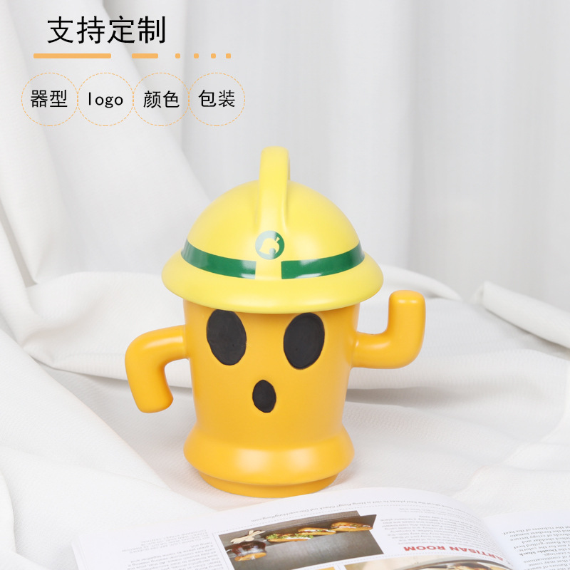 セラミックサボテンカップクリエイティブ個性かわいいヘルメット付き手描き植物高颜値セラミックカップ蓋付き