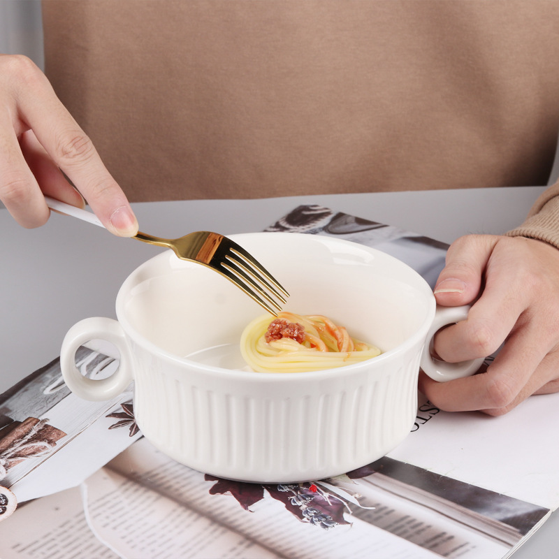 両耳の大きいサイズの陶磁器のスープの碗の家の泡の碗のクリーム風のサラダの碗の縦の紋の顔の碗の焙煎の碗は双の取っ手を持ちます。