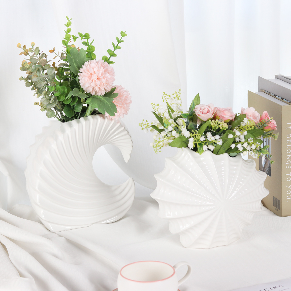 客間に白い波の貝殻を飾ってアイデアを生け花の花瓶の陶磁器の置物の花瓶を作ります。