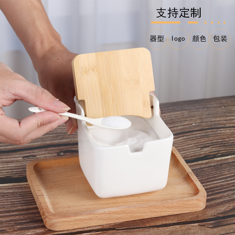 台所の四角い陶磁器の調味料の缶は活動の木の蓋を持って家庭の北欧の簡単な調味料の箱の調味料の缶の組み合わせのセットを持ちます。