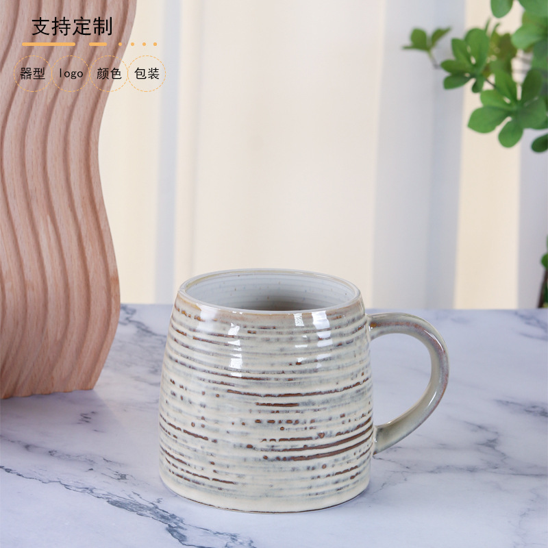 日本式レトロ粗陶牛乳朝食カップ家庭用オート麦カップコーヒーカップ陶磁器ストライプマグカップ
