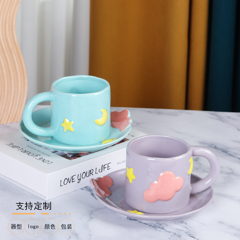 陶磁器の手描きのコーヒーカップの皿の小さい大衆の雲の高い顔の値の大容量の星の月の童話の杯のコーヒーのセット