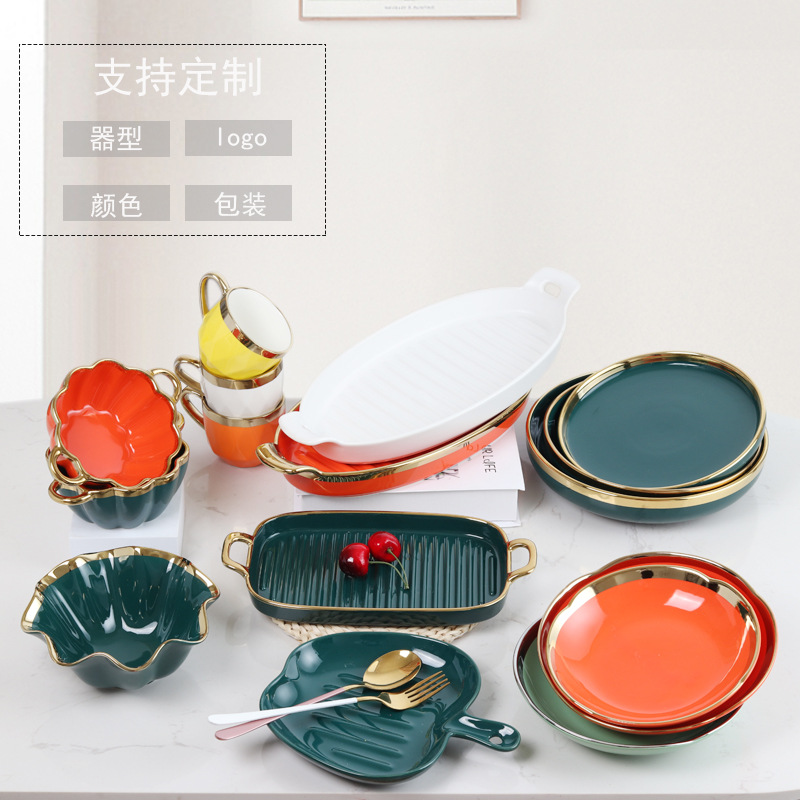 陶磁器ins風金辺碗皿組み合わせ食器家庭用軽豪華陶磁器朝食菓子皿果物サラダ碗