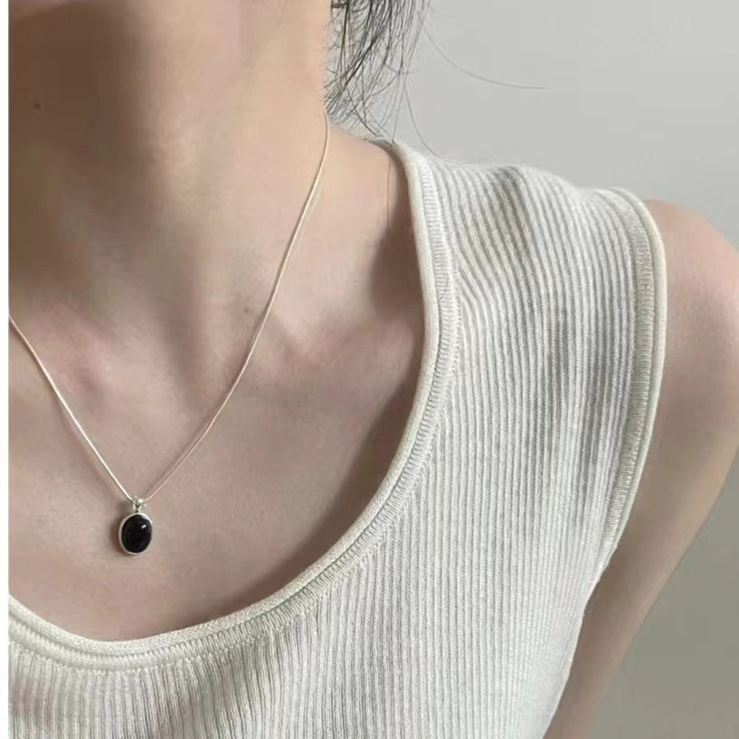 2024新型亮銀楕円黒曜石ネックレス女性軽贅沢ins気質高級感小衆デザイン鎖骨鎖