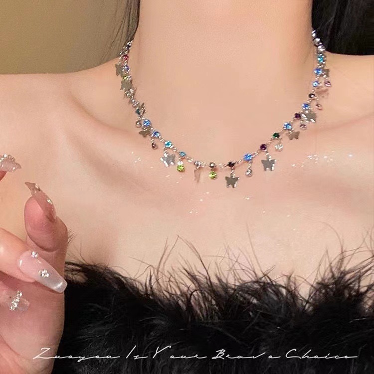 カラフルな夏 ~ カラーの蝶のジルコンのネックレスの女性の軽い豪華な大衆の設計感はギャルのフリンジの鎖を飾ります。