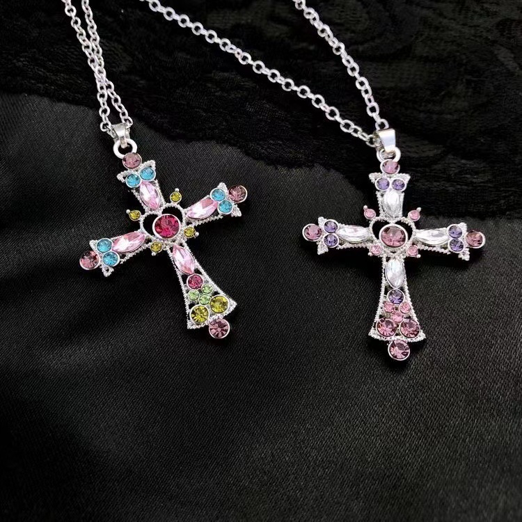 ピンクの紫のドリルの愛の十字のinsの復古はダイヤモンドのネックレスのゴシックの大衆の設計のy2k原宿の甘いクールなギャルを入れます。