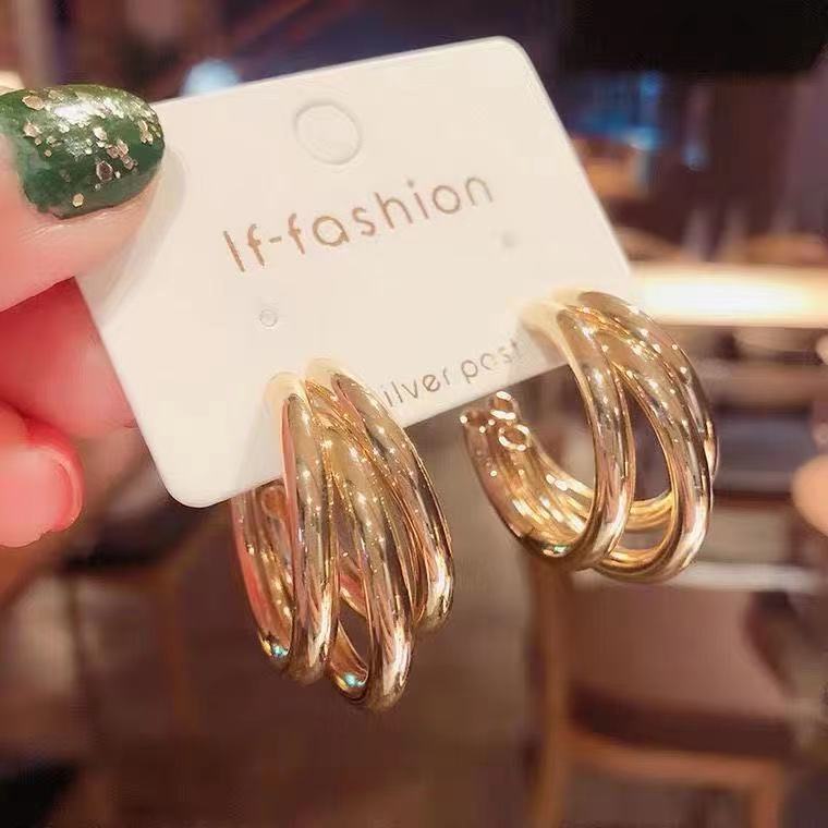 韓国気質ネット赤銀針三輪イヤリング2021年新型潮耳釘円耳飾り女性高級感大気