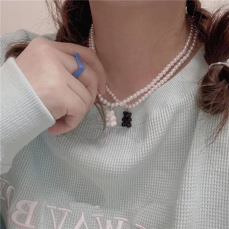 白黒キャンディー熊模造真珠チェーンネックレス少女かわいい熊重ねネックレス鎖骨チェーン真珠ネックレス